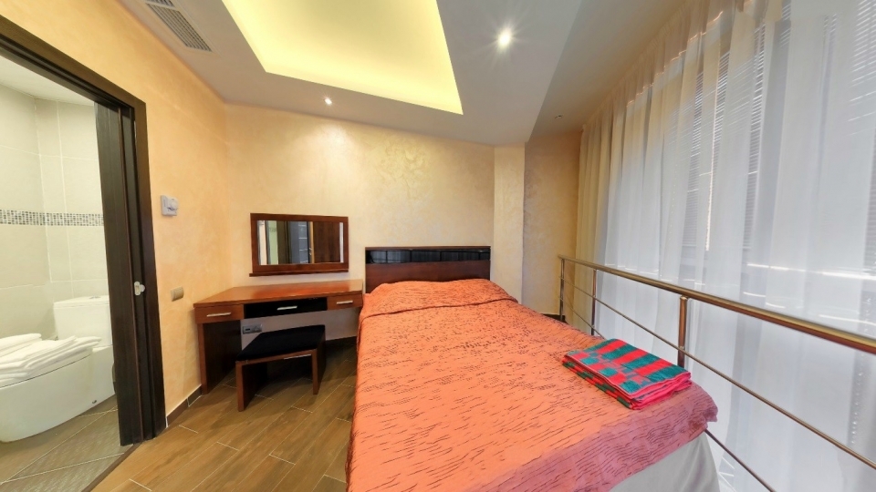 Оснащение номера: Двуспальная кровать, диван, обеденная группа, фен, тапочки, гладильный центр, телевизор – 3 шт., фригобар, шкаф для посуды, сервиз (6 персон), комплект столовых приборов (6 персон), сейф, wi-fi